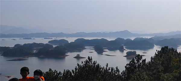 踏上游船甲板,清风习习,甚是舒畅。远看,绰绰约约的青山一嶂叠着一嶂,好似水墨泼就;近观,零星岛屿礁石洒落在清灵的湖水之上,仿若空悬。乘船而行,景致开阔而不单调、丰富而不繁杂,不禁感叹一句:真乃巧夺天工。