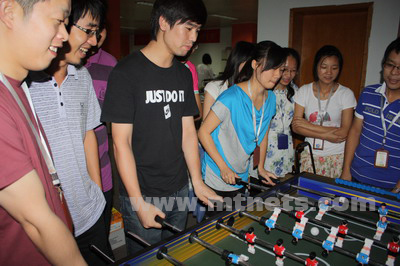7月初,在南非世界杯如火如荼进行着的时候,明通公司桌上足球比赛也开打了。桌上足球是个新鲜的玩意,绝大部分人都没玩过,虽然如此,但依然有64位同事激情的参与,公司总经理、市场总监等足球爱好者也纷纷参与其中。
