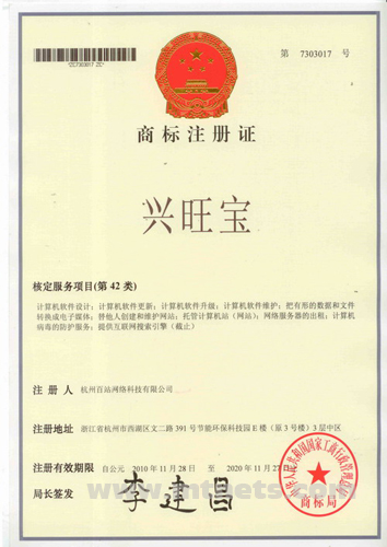 2010年11月,明通科技新增两件注册商标,经国家商标局批准的“百站”、“兴旺宝”正式通过注册商标42类服务项目申请,并核发商标注册证。
