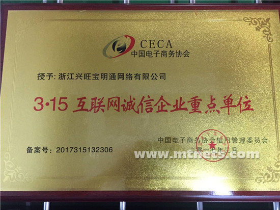 我司经过严格的评审、认证并通过,荣获了由中国电子商务协会(CECA)颁发的“3.15互联网诚信企业重点单位”荣誉称号,近日获得相关证书牌照,成为互联网行业获得“诚信网站”认证企业之一。凭借优质的服务质量、行业信誉度和良好的企业社会责任,我司通过权威行业评审,为客户们提供了多一层安全保障。获此殊荣是中国电子商务协会对兴旺宝的充分认可,也是对兴旺宝人的工作极大肯定。