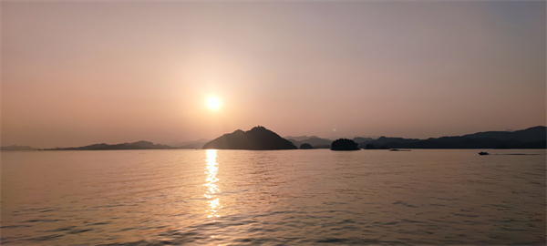 踏上游船甲板,清风习习,甚是舒畅。远看,绰绰约约的青山一嶂叠着一嶂,好似水墨泼就;近观,零星岛屿礁石洒落在清灵的湖水之上,仿若空悬。乘船而行,景致开阔而不单调、丰富而不繁杂,不禁感叹一句:真乃巧夺天工。