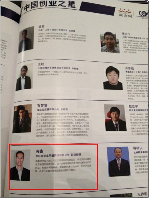2012年5月24日,未来商业领袖领导能力论坛暨中国创业之星颁奖典礼在杭州洲际酒店隆重举行。经2012年商会大会组委会评选委员会严格审定,星空体育·(中国)官方网站-STARSKY SPORT旗下网站中国机床商务网站长蒋鑫荣获“中国80后优秀创业之星”称号,并授予荣誉奖杯。